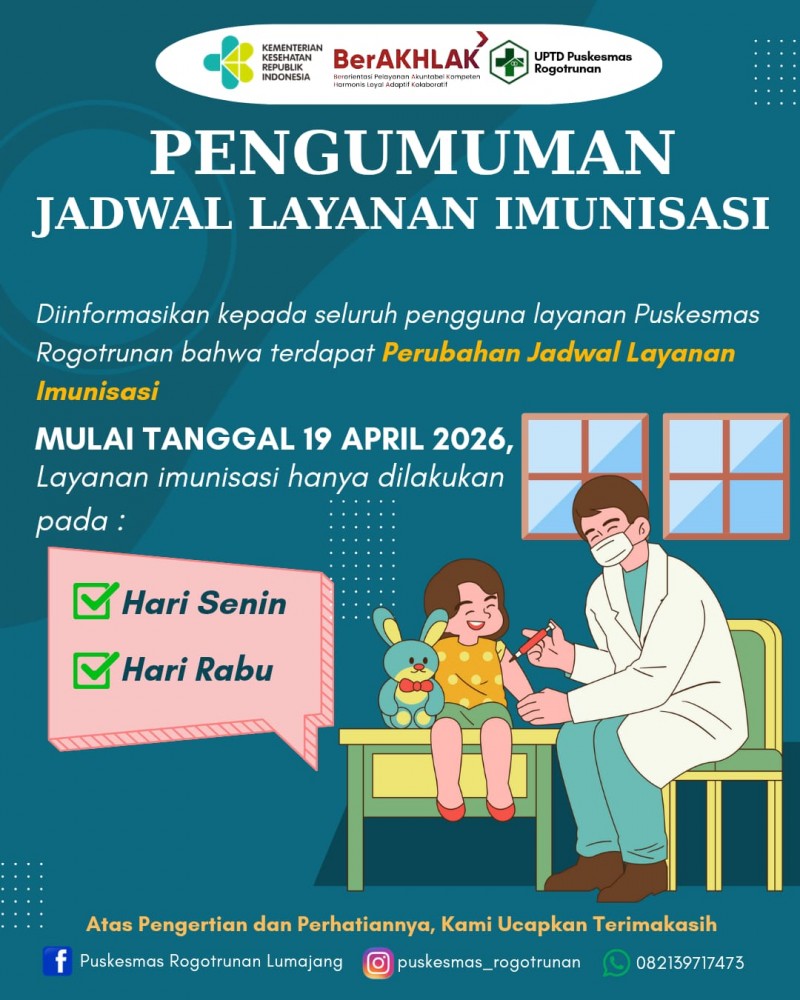LABRUK LOR, KIM - UPTD Puskesmas Rogotrunan secara resmi mengumumkan adanya perubahan jadwal layanan imunisasi bagi masyarakat. Kebijakan ini mulai diberlakukan sejak 19 April 2026 sebagai bagian dari penyesuaian pelayanan kesehatan kepada masyarakat.